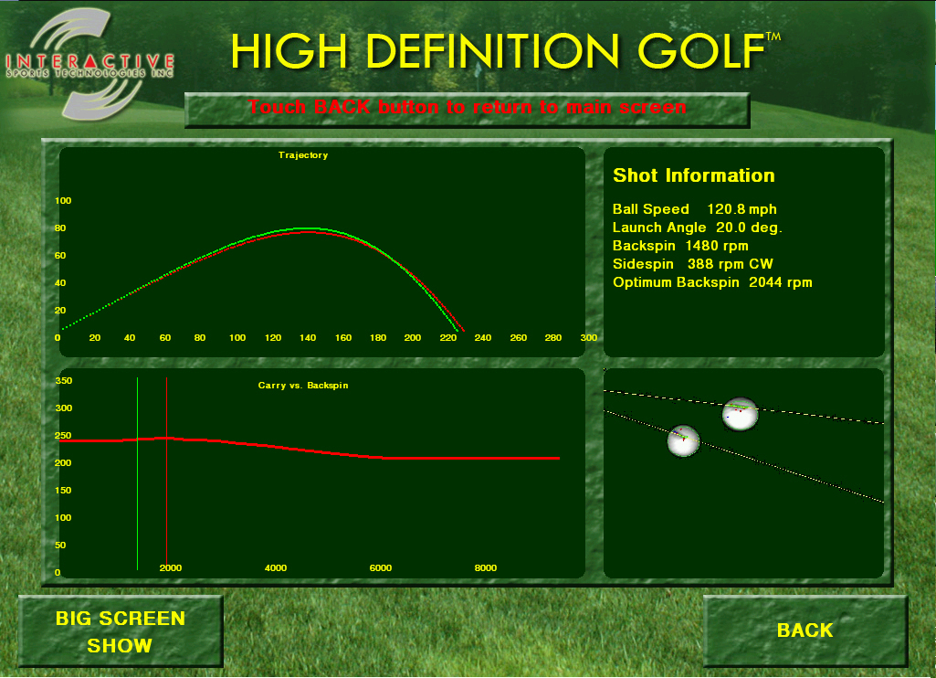 The launch monitor module provides highly accurate measurement of launch angle, ball speed and spin rate. The launch monitor is placed beside the tee position and has a close-up view of the golf ball. Advanced computer vision techniques are used to capture and analyze launch characteristics. The module can be used alone or integrated with the HD Golf simulator so that the flight path of the ball is shown on the simulator. The launch monitor is typically used to maximize driving distance by optimizing launch angle and ball type (low, medium, high spin) for a given ball speed. The unit has several significant advantages over competitive launch monitors including:
